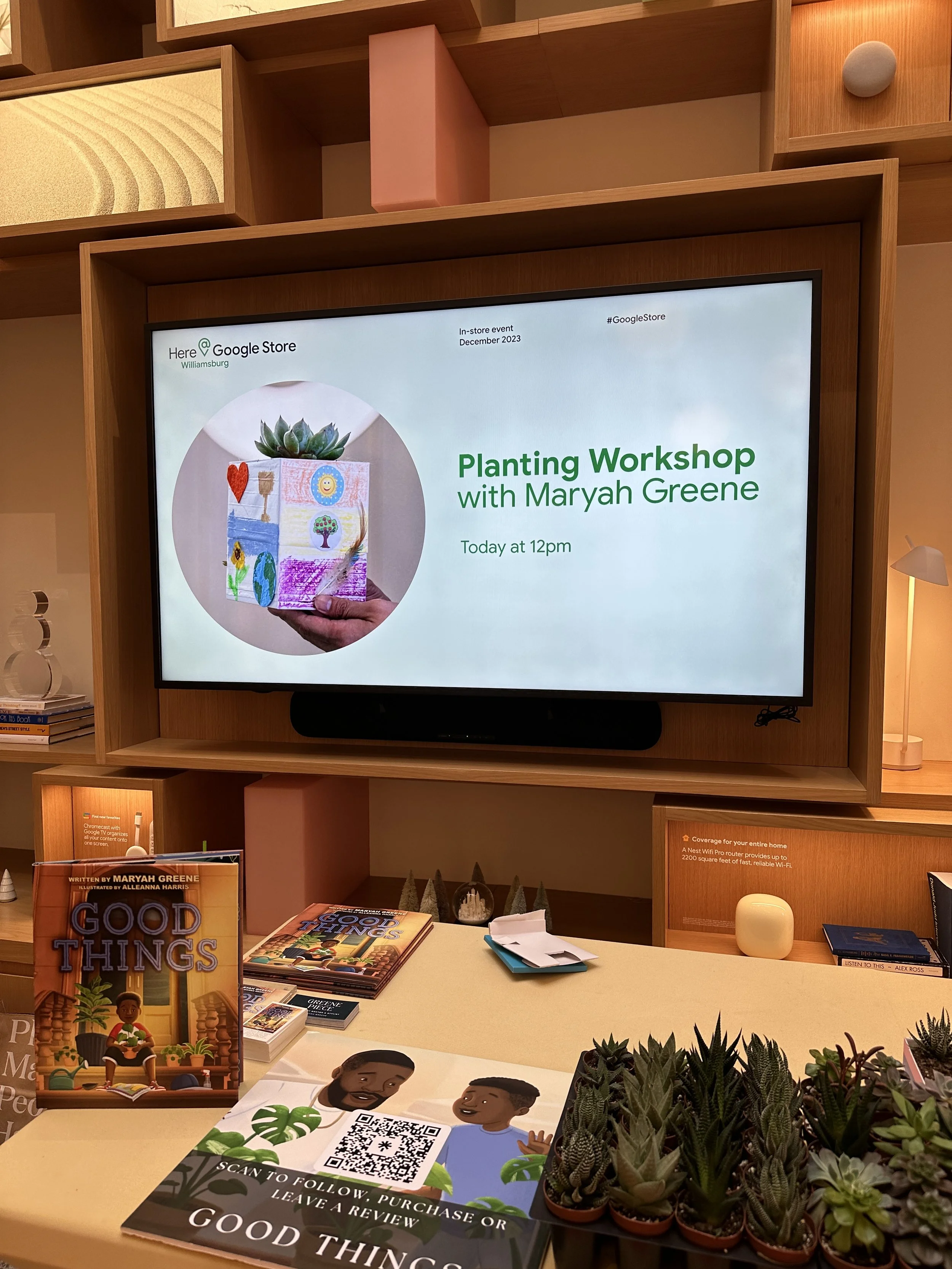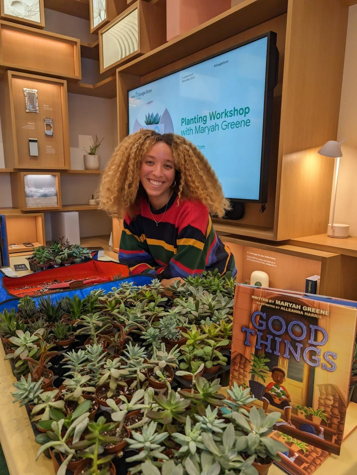 Approached by Penguin Random House in 2020, Maryah expanded her brand, Greene Piece by publishing and debuting Good Things, a 28-page picture book released in August of 2023. Inspired by her time spent as an educator in underserved communities, Maryah tells a tender and necessary story about love, loss, hope and memory through plants. With a goal of spotlighting the mental health needs of black and brown children of color, Good Things aims to destigmatize grief and the ways in which it is expressed and validated within communities of color.